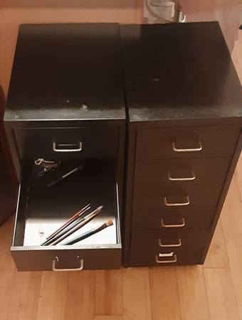 Multi-use 2 sturdy wheeled metal drawers that fit under desk - 27" tall 11" wide 16" deep, $60 each