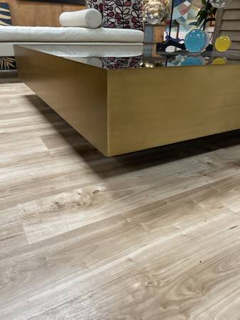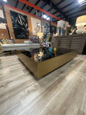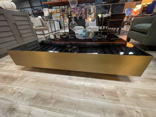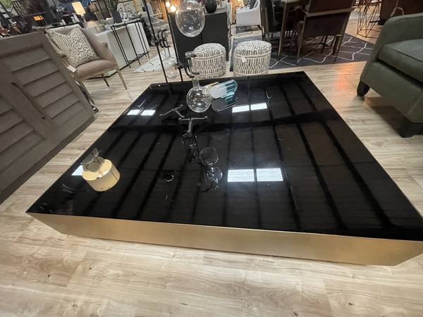 Very glamorous, large coffee table. Black glass top with floating brass sides 5 feet x 5 feet square. From Restoration Hardware