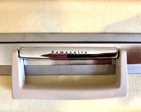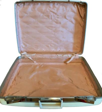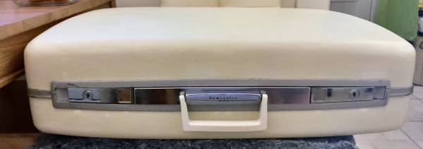 The item has been thoroughly cleaned and deodorized inside and out. The exterior shell has a few scratches which are commensurate with the item’s age and use; they are readily camouflaged with a translucent “natural” color putty wax filler crayon like Mohawk Fil-Stik. To go by the ads for this line of luggage, the “Polar White” shell was not originally a uniform off white but rather was meant to look somewhat mottled as if a slightly darker tone had been sponged across the surface. The item in this posting is gratifyingly less splotchy.