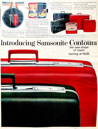 This hefty piece of vintage hard shell luggage from the mid-1960s (at 26 inches across, this model wasn’t called the “Pullman” for nothing!) belongs to a swank product line—‘Contoura’— that Samsonite promoted by way of a series of engaging full-page magazine ads featuring the “jet set” on the go in all their technicolor winking hipness as they explore the modern world. While Samsonite’s now iconic mid-century modern wares have by and large retained their value and lived up to the endurance claimed for them (“A million miles from now, nobody will guess it isn’t new”), luggage from this particular line is relatively hard to find nowadays as compared to, say, Samsonite’s ‘Silhouette’ suitcases. While the color choices were originally promoted as gender specific—Polar White was apparently seen as a ladies’ color in 1965—by today’s sensibilities, the off-white here seems more gender neutral.
