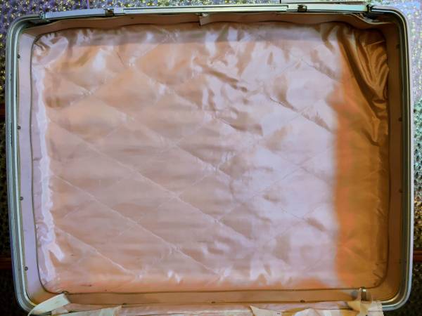 The blush satin lining is intact and exhibits only minimal discoloration. There are no elastic ruffled pockets inside, however, as one would expect and some of the straps for securing the contents in place as well as the flip-down divider separating the top and bottom compartments are missing. The oblong rectangular satin “concealer” which bridges the top and bottom halves and covers over the hinges when the suitcase is open is ripped in two places and would benefit from being replaced with matching fabric.