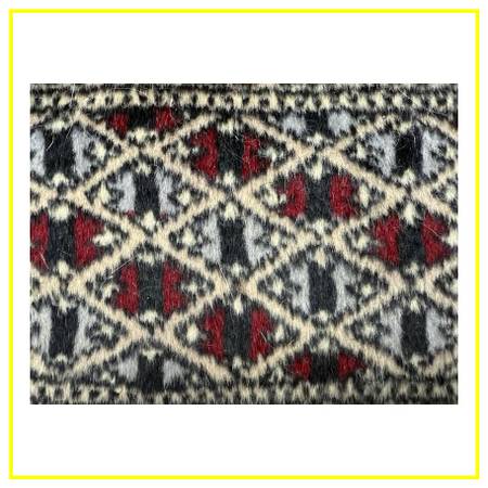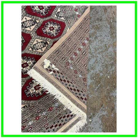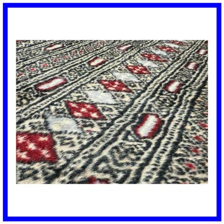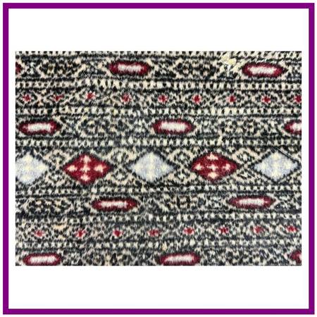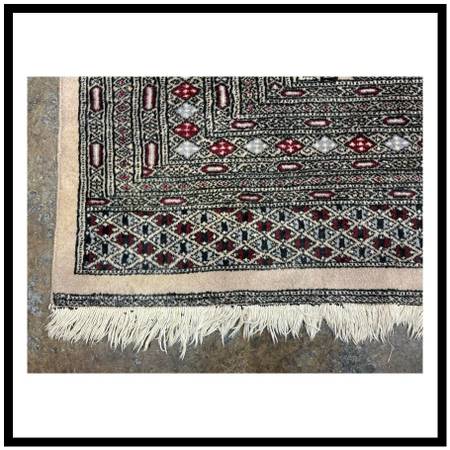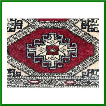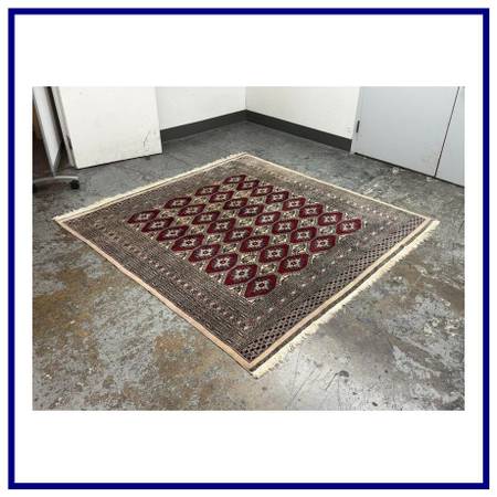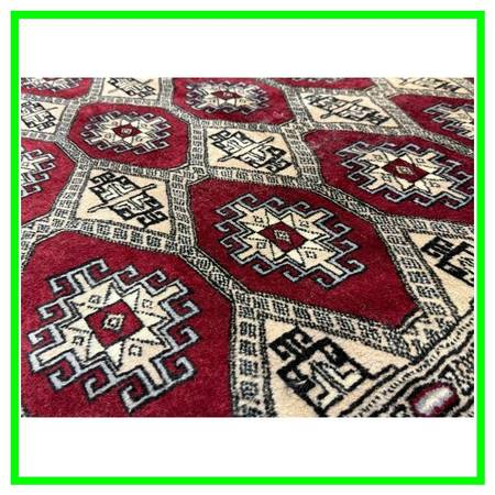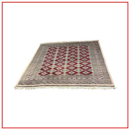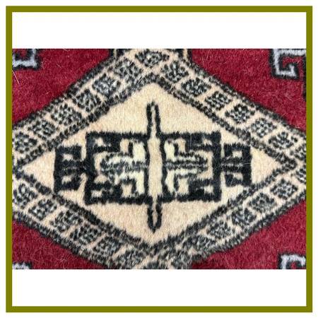 Design Plus Gallery presents a 7ft 7ft1in Pakistan Wool Area Rug. Handknotted by skilled artisans in Pakistanoften in urban centers like Karachi and Lahore and in tribal regions near the Afghan borderthis wool rug reflects a blend of Persian and Turkmen weaving traditions. The classic Bokhara design features repeating geometric motifs arranged symmetrically in tidy rows, framed by coordinating borders. A rich palette of red is balanced by black, offwhite, and light gray tones, giving the piece depth and versatility. The nearsquare size is ideal for anchoring a seating area, entry, or dining nook. In good condition, visible and minimal wear. Would benefit with a professional cleaning.