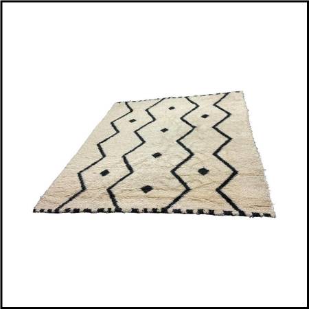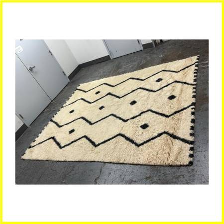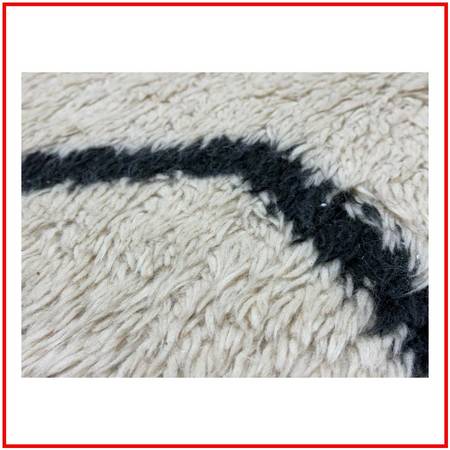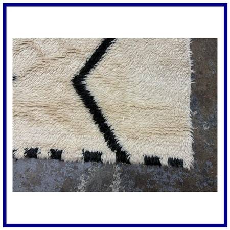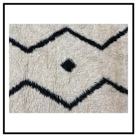 Design Plus Gallery presents the 7ft 9in x 9ft 7in Mala Area Rug from Madeline Weinrib. The rug is a moroccan inspired rug made with New Zealand wool for a plush texture. A distinctive diamond pattern with center squares is in black making the rug very striking and sensual. The style is no longer in production with the brand. It has visible wear that is consistent with its age + use.