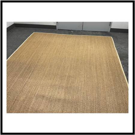 Design Plus Gallery presents a 8ft12in 12ft1in Custom Woven Seagrass Area Rug. Large woven seagrass area rug in a natural finish with custom trim and a tailored border. The organic texture and warm, neutral tone add effortless, coastalinspired style while the sturdy, lowprofile weave anchors larger spaces without overwhelming them. Preowned and in fair condition with visible discoloration from useexpect noticeable color variation and traffic patterns. A great, budgetfriendly foundation piece for living rooms, dining areas, or openplan spaces. In good condition, visible and minimal wear from usage.