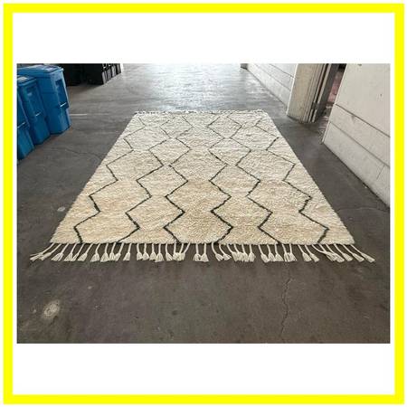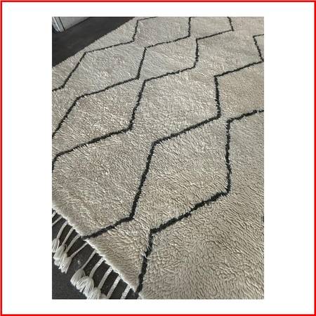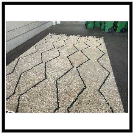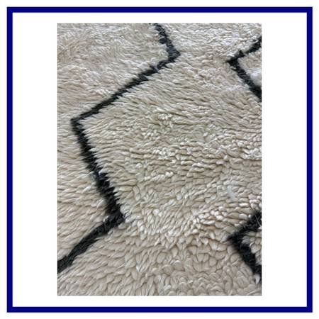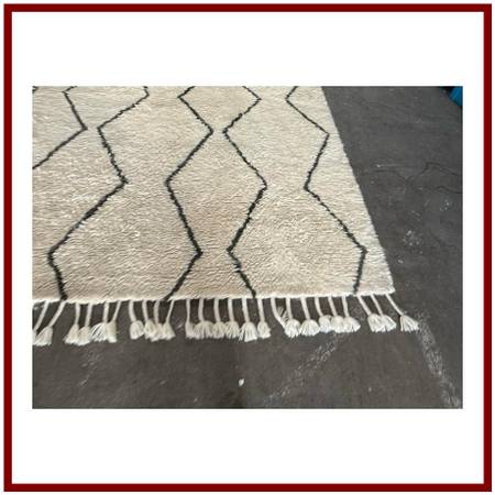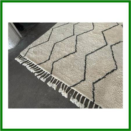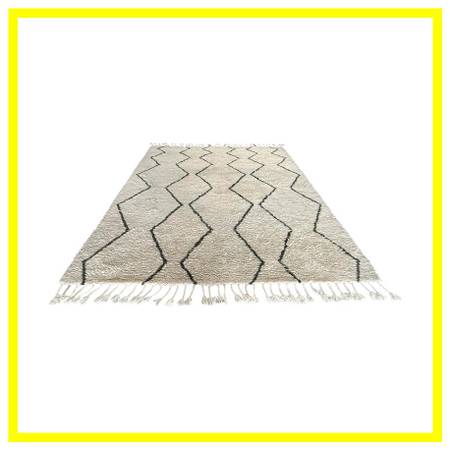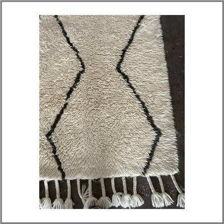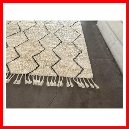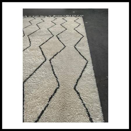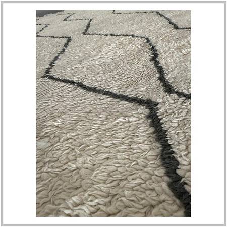 Design Plus Gallery presents a 9ft 12ft9in Souk Shag Area Rug from West Elm. The rug has a handwoven feel with a high pile shag of 100% wool. It has an inspired look similar to Moroccan designs. It offers a geometric pattern in black over an offwhite background. It has a welcoming look and feels great when underfoot plus it has durability to last for many year. All of the long braided tassels are hand done one both ends Visible wear; condition is good for its age + use. Made in India.
