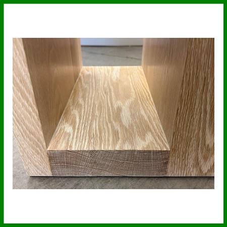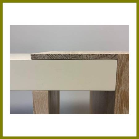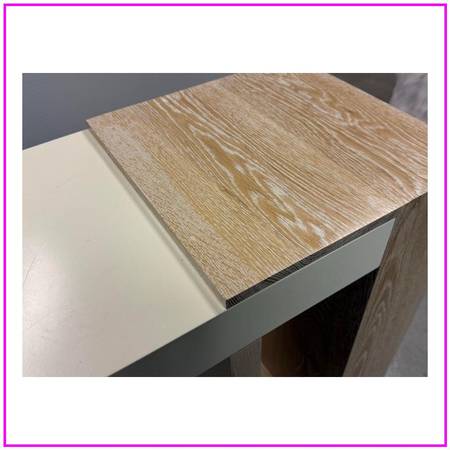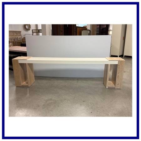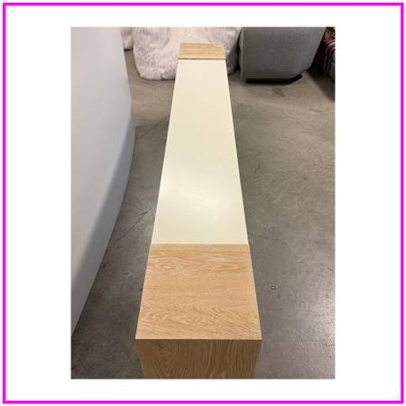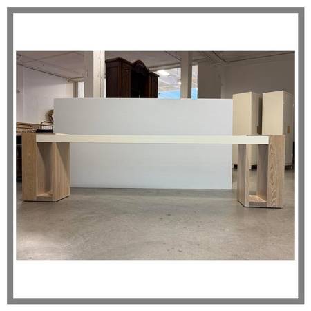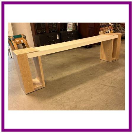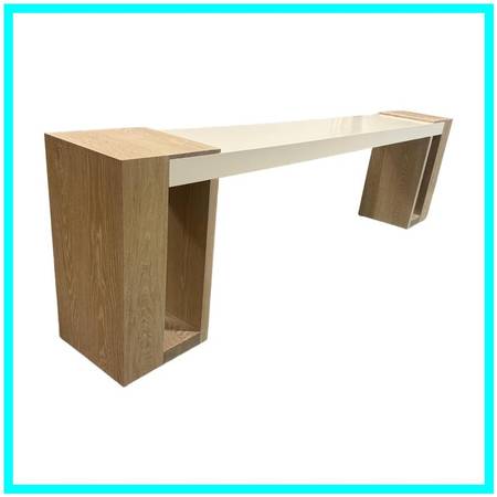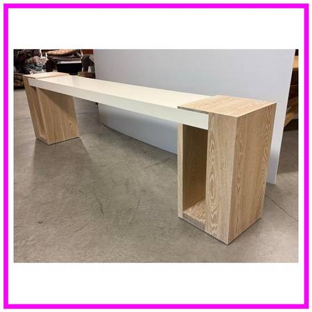 Design pLus Gallery presents the Alfred Console Table from J. Alexander Furniture. A truly magnificent console table that adds a refreshingly clean and organic profile into your home. This piece was customized with a longer surface than their standard size. It is made with the use of bleached oak wood that anchor the piece and has a satin white finish surface. The juxtaposition of the materials at each end is high design and takes a skilled team to produce. Overall this console is in good condition for its usage. Made in the USA.