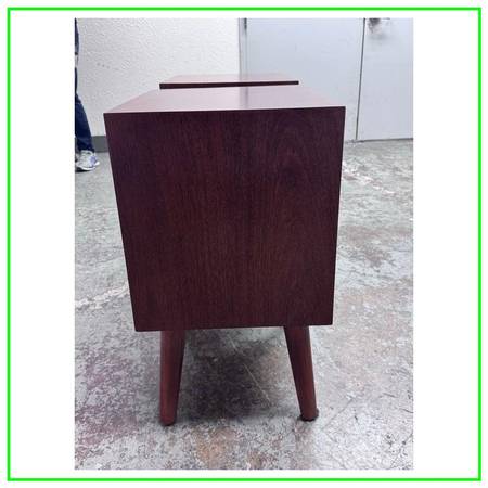 Crafted from woods and veneers. Features two drawers and tapered legs. In good condition, visible and minimal wear from usage. Made in Indonesia.
