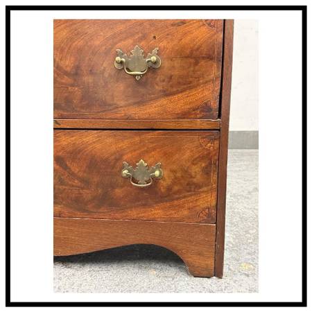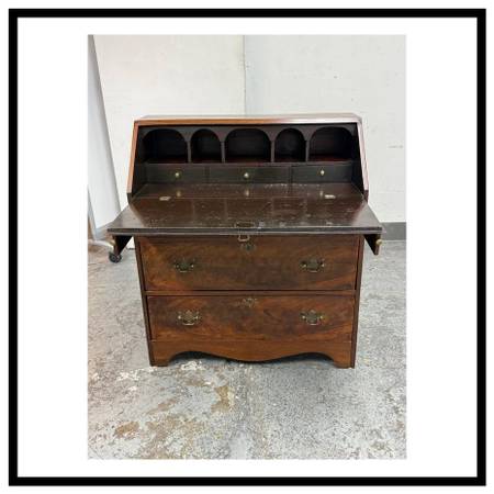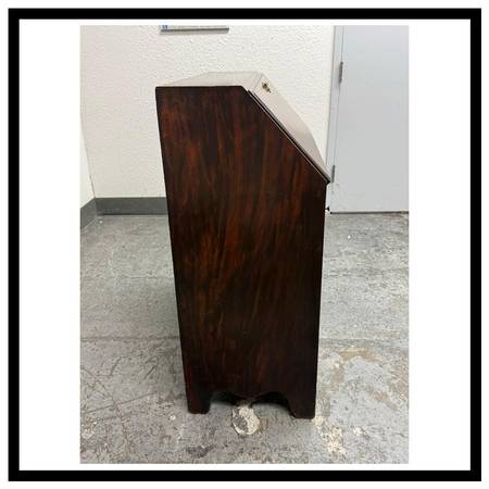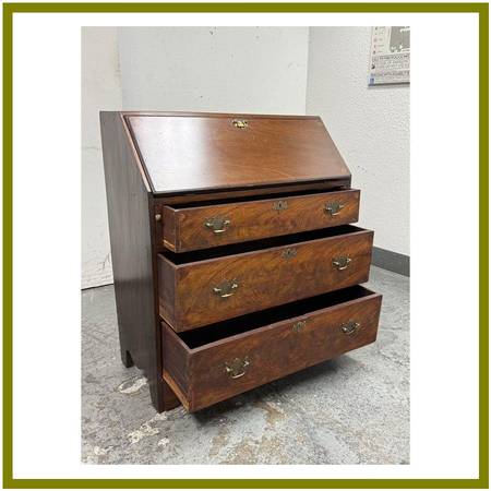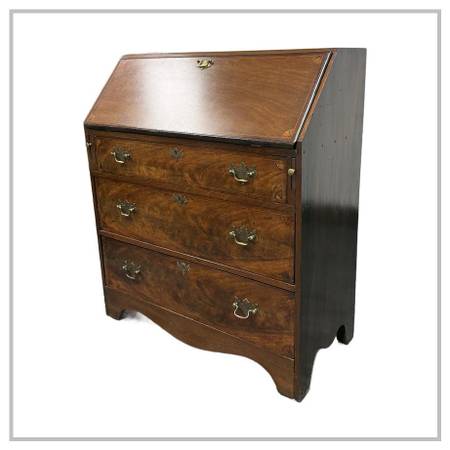 Design Plus Gallery presents a Chippendale Style Slant Front Secretary of Vintage to Antique Age. The desk has mahogany veneer, white pine and poplar with a dovetailed case, slanted lid with banded veneer, lopper support, interior with prospect door, and various other elements to store your stationary, mail and writing instruments. In good vintage condition, visible scratches and wear from heavy usage. Does not come with a key.