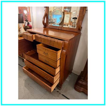 Design Plus Gallery presents a Solid Wood and Veneer Front Dresser with Mirror from the Early 20th Century. The dresser is unique and rare find with its use of drawers and interior cubby. The piece is made from solid wood and has a finely done veneer over that matches up wood grain for an elevated look. The dresser has eight drawers of various sizes and one cabinet door with open cavity that goes to full depth of the piece. Each drawer and the cabinet door has a locking key. The design is fine too, with scrolled arms holding the spinning mirror and claw feet fronts. The dresser is in good condition for its antique age + use.