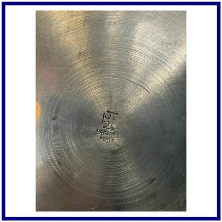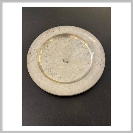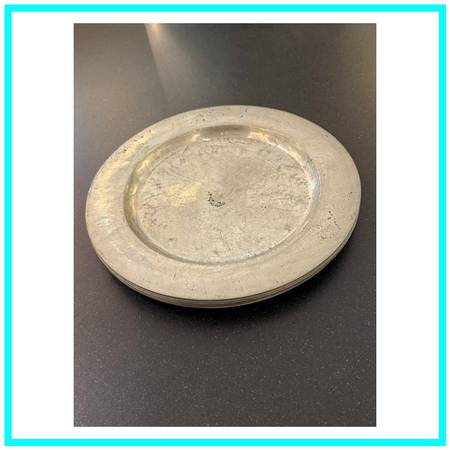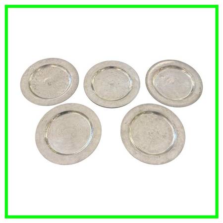 Design Plus Gallery presents a Set of Five Portuguese Pewter Plates by Ergarte Porto. The set of dishes is not meant for serving but make great chargers to serve upon. Pewter was used for decorative metal items and tableware in ancient times by the Egyptians and later the Romans, and came into extensive use in Europe from the Middle Ages until the various developments in pottery and glassmaking during the 18th and 19th centuries. They show visible wear with scratches and marks that are consistent with their antique age.