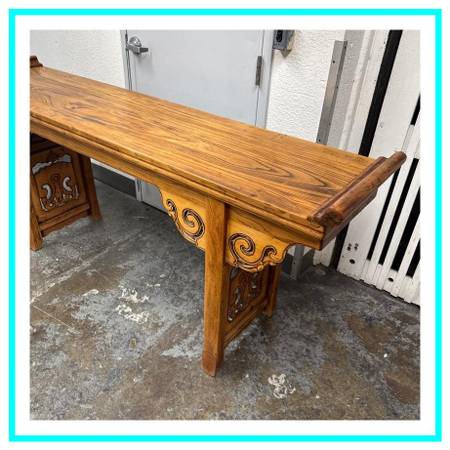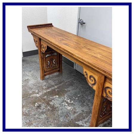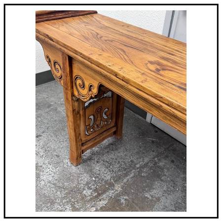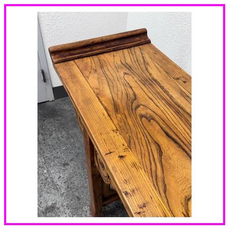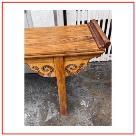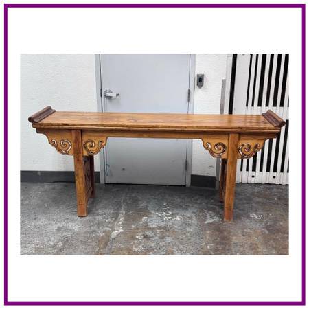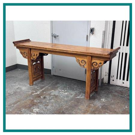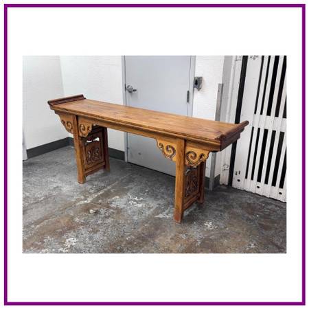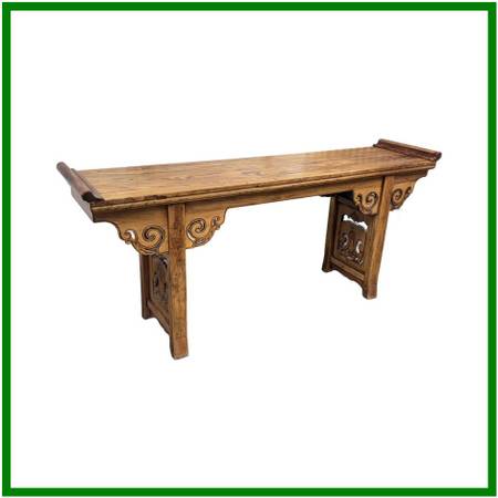 Design Plus Gallery presents a Qing Dynasty Style Altar Console Table made from Elmwood. The Qing Dynasty altar console table presents a stately rectangular top framed by dramatic everted flanges. The apron is embellished with handcarved cloudy scroll motifs, its scrolling spandrels flowing into the straight, disciplined lines of the legs for a striking interplay of movement and restraint. Originally conceived for ceremonial display, its generous size with a clean profile make it an exceptional focal point in a contemporary settingideal as a console in an entryway, living room, or gallery. This Qing dynasty example beautifully encapsulates the periods artistry, with its carving to its confident proportions and refined joinery. In good condition, visible discoloration and minimal wear from usage.