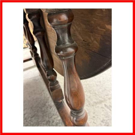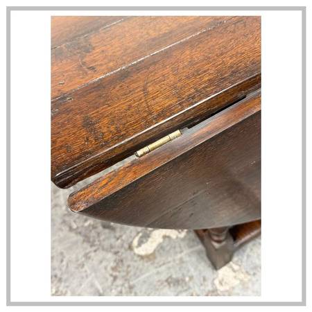 Design Plus Gallery presents an Antique English GateLeg DropLeaf Table. A timeless staple of English design, this versatile gateleg table is crafted from solid wood in a rich, dark finish. The round top opens to create an intimate dining surface, then folds down to become a long, narrow consoleideal for entryways, behind a sofa, or along a hallway. Elegant balusterturned supports and molded peripheral stretchers provide both visual refinement and sturdy, enduring construction. A spacesmart piece that transitions effortlessly from a round dining table for guests to a slim console when needed. In good condition, visible and minimal wear from usage.