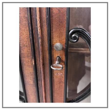 Design Plus Gallery presents a Victorian Antique Storage Cabinet. A remarkable showcase of fine craftsmanship and timeless elegance. Meticulously crafted from solid woods and the finest veneers, this impressive piece combines durability with sophisticated aesthetic appeal. The hutchs glass doors are framed in a striking black finish, adorned with intricate carved wood details featuring scrolling motifs and urns blooming with delicate flowers, evoking a sense of classic artistry. The door fronts display a veneer diamond print motif, enhancing the rich texture and visual interest of the hutch. Below, three spacious drawers offer practical storage in the base. A black finish that outlines the top border and base for a cohesive, dramatic look. The aged, distressed surface tells a story of heritage and authenticity, embodying genuine antique charm. Behind the glass doors, the hutch provides customizable storage with three small adjustable shelves on the left and three larger adjustable shelves on the right, perfect for displaying collectibles, fine china, or treasured heirlooms. The hardware is crafted from brass, complementing the hutchs historic character and adding to its oldworld allure. A statement piece for any traditional or vintageinspired interior, this antique hutch radiates warmth, sophistication, and enduring style. In good antique condition, visible and minimal wear from usage.