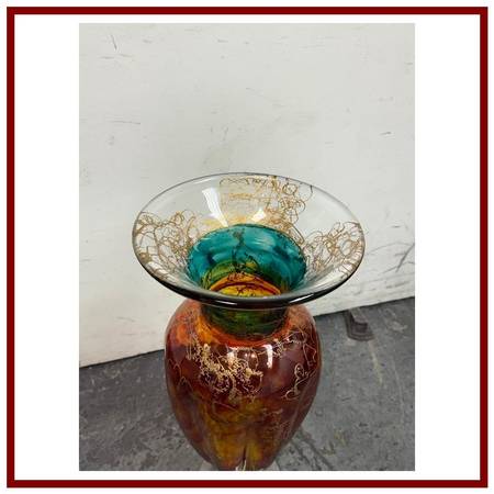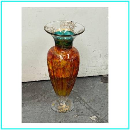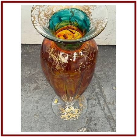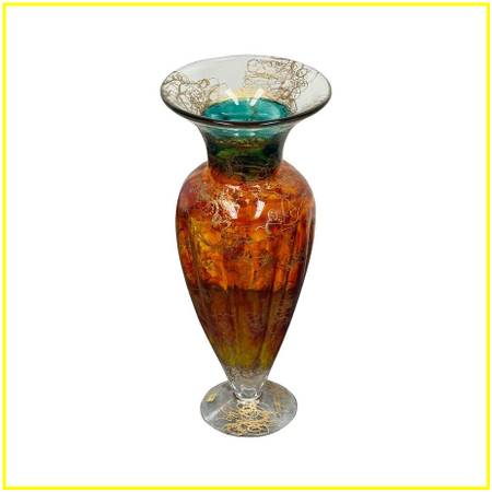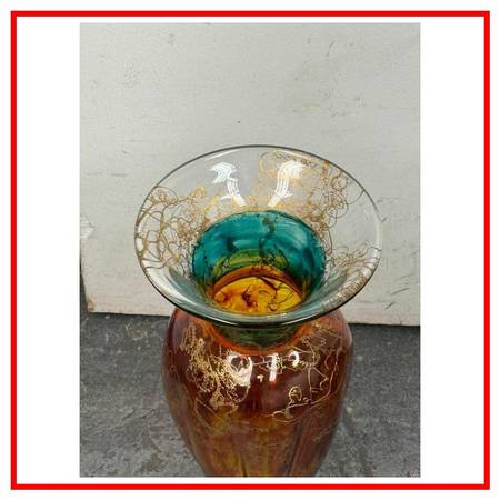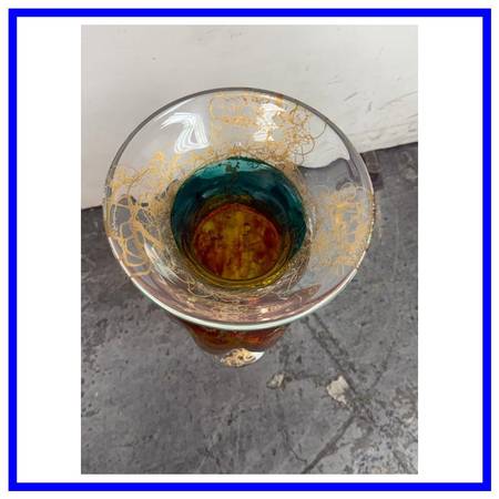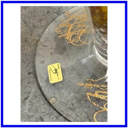 Design Plus Gallery presents the Cassandra Vase by Austrian Artist, Asja Valcic. The vase was designed and hand painted in the 1980s with the artists signature + brand sticker on the base. The transparent vase has golden etching with an amber on the majority of its body + emerald green at the neck. It is in good condition, minimal wear.