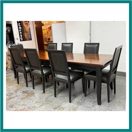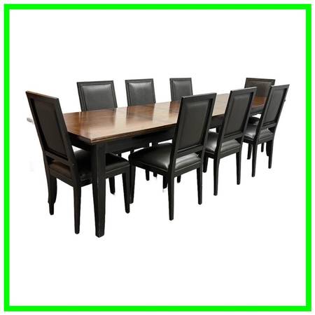 Design Plus Gallery presents an Extension Dining Table + Eight Chairs by Buying and Design for Crate Barrel. This is a vintage set that charming, farmhouse aesthetic with a dark brown surface on the table top and black frames to the table legs and all the chairs. The chairs have a padded leather seat, also in black, and a slight lean to the back rest. The table expands with the addition of three extensions for entertaining or more workspace. Visible surface wear is present to the frame and chairs but they are overall in good structural condition. Made in Italy.