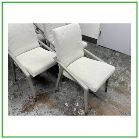 Design Plus Gallery presents a Set of Six Expressions Dining Chairs from Caracole Modern. Smart and shapely, these sleek chairs draw inspiration from architecture. Its svelte silhouette gives a nod to geometric influences that are present yet not overwhelming. Integrated arms provide support while harmonizing with its overall shape. Fully upholstered, their comfortable design will support long dinners and lengthy conversations with family and friends. Its Mink Gray frame is capped with metal ferrules in Zinc Oxide for a touch of metallic shine. They are in good condition for its age with minimal surface wear that is consistent with use.