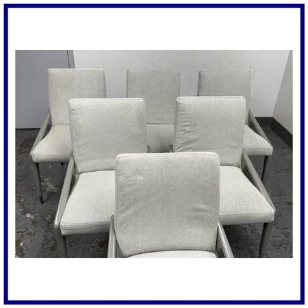 Design Plus Gallery presents a Set of Six Expressions Dining Chairs from Caracole Modern. Smart and shapely, these sleek chairs draw inspiration from architecture. Its svelte silhouette gives a nod to geometric influences that are present yet not overwhelming. Integrated arms provide support while harmonizing with its overall shape. Fully upholstered, their comfortable design will support long dinners and lengthy conversations with family and friends. Its Mink Gray frame is capped with metal ferrules in Zinc Oxide for a touch of metallic shine. They are in good condition for its age with minimal surface wear that is consistent with use.