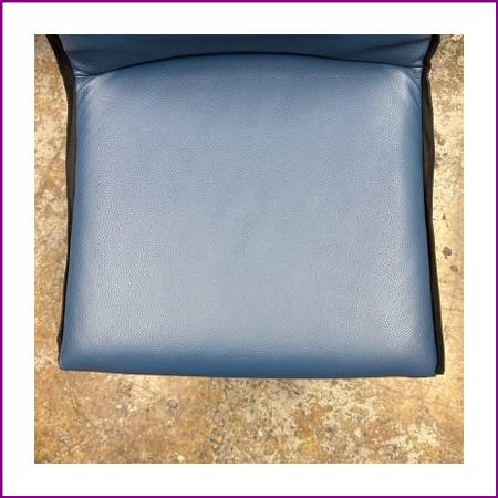 Design Plus Gallery presents a Set of Eight EOOS Embrace Collection Leather Dining Side Chairs from Carl Hansen Sn. The blue leather fabric folds around the top and bottom edges and perfectly enwraps around their shaped black wooden frames creating a striking contrast. The chairs embody the unity of craftsmanship with innovative design. The frames are an oak black finish and Thor leather with black trim. They are gently padded for a soft, yet supportive seat. In good condition, minimal wear from usage. Made in Denmark.