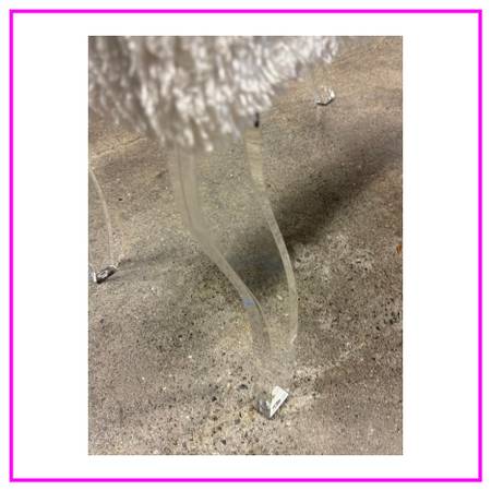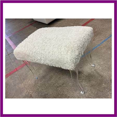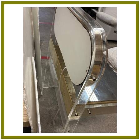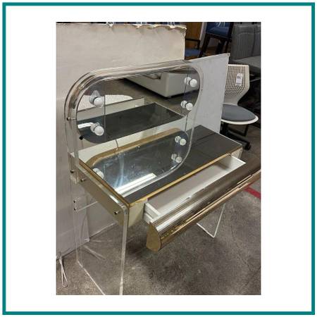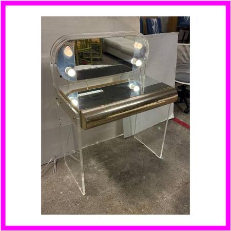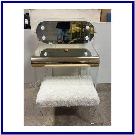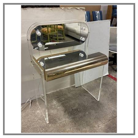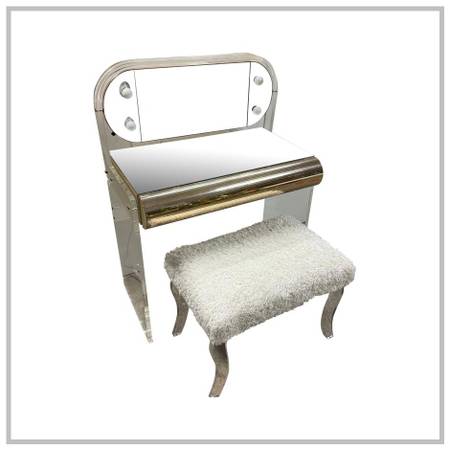 Design Plus Gallery presents a Vintage Lucite Vanity + Bench from Hill Manufacturing. Creations at Dallas designed this luxe piece back in the 1980s with all the glamour puss of opulence, elegance, and perhaps even a touch of theatrical flair, potentially appealing to someone who embraces a glamorous lifestyle. The vanity and frame of the bench are made from Lucite with the legs on the ottoman have a turned out appeal similar to cabriole legs and it has a plush white seat. The vanity has a mirror with four lights at each corner, applied brass tiles, and a single drawer. Visible wear is present to the lucite with visible scratches. Minor breakage on the brass plates. Considered to be in consistent good condition for its vintage usage. Made in Dallas, Texas, USA.