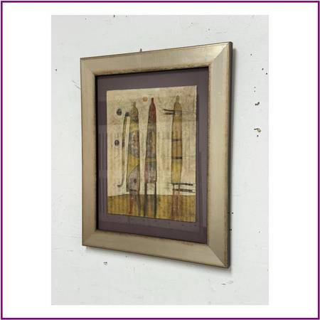 Design Plus Gallery presents a Circa 2013 Missing in Action Mixed Media by Artist Scott Bergeyart. Features Three shadowlike figures that seem to appear and recede through layered mixed media. Subtle textures and washes play against touches of yellow, red, and purple, creating a moody, modernmeetsretro atmosphere that feels both intimate and enigmatic. The composition balances figuration and abstraction, inviting quiet reflection on presence, memory, and the spaces in between.In good condition, minimal wear from usage.