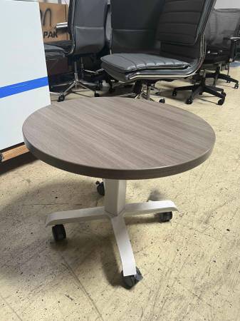 (1) Used 24D x 19H mobile utility or coffee / end table in light walnut laminate with white 4 star metal base with locking casters $150
