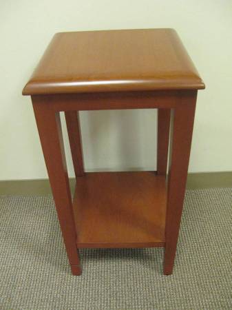 (1) Used 15"W x 15"D x 29"H square end table with shelf in cherry wood with 2" thick waterfall solid wood edge band $165