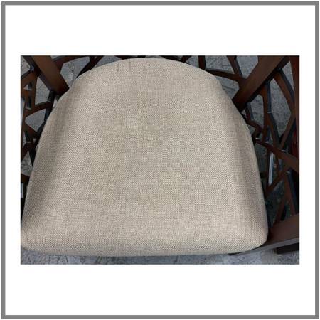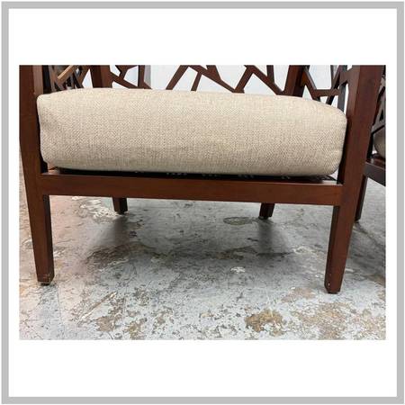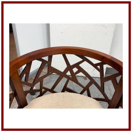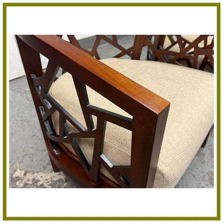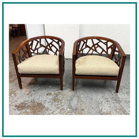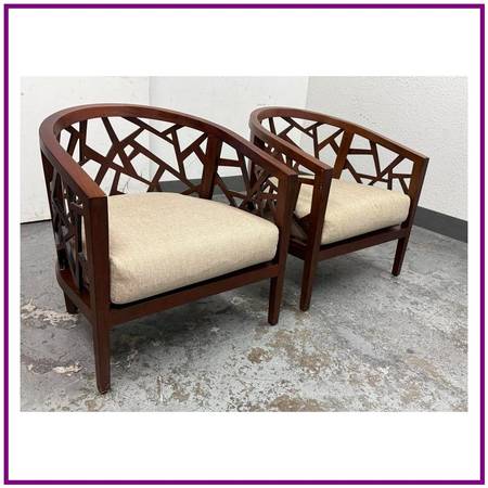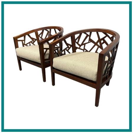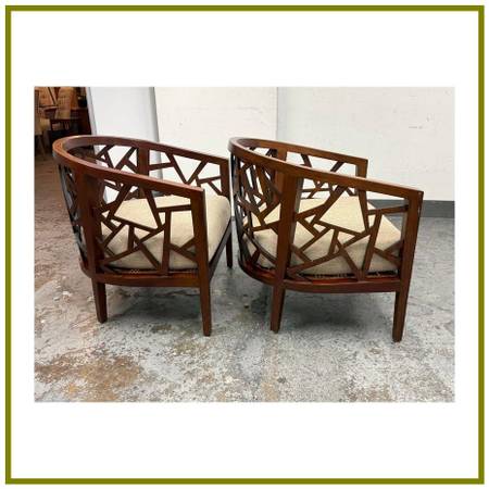 Design Plus Gallery presents a Pair of Ankara Chairs from Crate Barrel. The chairs were designed to be appreciated from every angle. They offer an intricate open curve of handcut and handpieced hardwood that opens up to an artistic and architectural 360degree view in the living room. The chairs geometric barrel design is inspired by Indonesian mosaics and handcrafted by the islands skilled artisans of solid ash with a walnut finish. Their handwoven tropical cane seats hosts a comfortable thick seat cushion, upholstered in a heavyweight blend of rayon, flax, and cotton that yields slight luster. This style of chair is no longer in production with the brand. Visible wear to the cushions is present but overall they are in good condition for their usage.