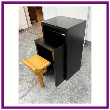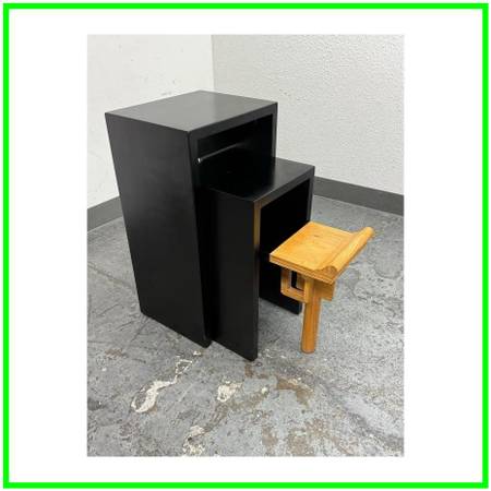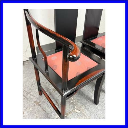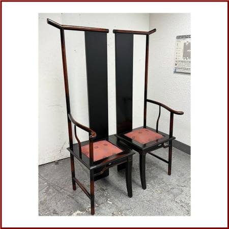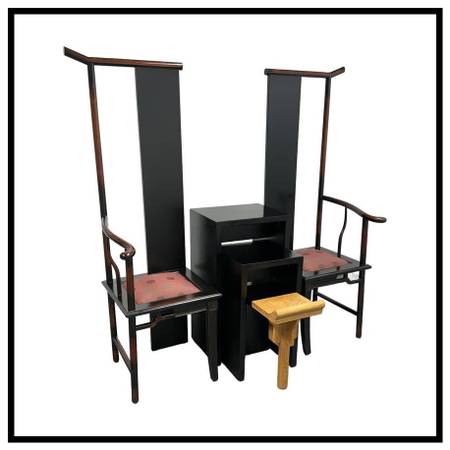 Design Plus Gallery presents a Pair of Ming Style High Back Chair + Nesting Center Side Tables for Couple. Introduced as a Couples Tea Service Set, the two elongated chairs with expanding tables are about serving tea when opened or closed up when not in use. The chairs are made of solid, and rounded wood framing with curves presents reflecting the style of Ming. The seat pads are in a red silk with a matching pattern work. The tables are two toned of a dark, near black finish with a half maple finish on the shortest table. The set as a whole does show some physical signs of distress but is overall in good condition for its vintage usage.
