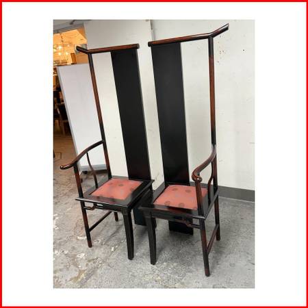 Design Plus Gallery presents a Pair of Ming Style High Back Chair + Nesting Center Side Tables for Couple. Introduced as a Couples Tea Service Set, the two elongated chairs with expanding tables are about serving tea when opened or closed up when not in use. The chairs are made of solid, and rounded wood framing with curves presents reflecting the style of Ming. The seat pads are in a red silk with a matching pattern work. The tables are two toned of a dark, near black finish with a half maple finish on the shortest table. The set as a whole does show some physical signs of distress but is overall in good condition for its vintage usage.