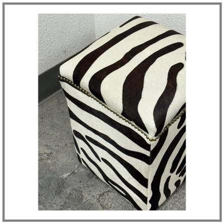 Design Plus Gallery presents a Custom Design Zebra Print Ottoman/Footstool. Upholstered in a distinctive blackandwhite pattern that evokes zebra hide, bringing bold personality to any room. A refined antique silver finish outlines the top, adding a touch of glam contrast to the graphic upholstery. In good condition, visible and minimal wear.