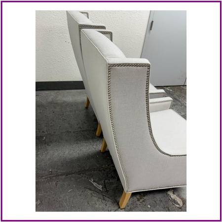 Design Plus Gallery present s a Pair of Custom Arm Chairs. A fine blend of modern aesthetics and traditional design elements. The tight back is both supportive and sleek, offering a firm and comfortable seating experience. The loose seat cushions add a touch of relaxed elegance, allowing for easy cleaning and adjustment for ultimate comfort. The chairs are upholstered in a light gray Kravet fabric, a highquality material known for its durability and softness. The color is a versatile shade of gray, allowing these chairs to seamlessly blend into a variety of interior decors. Adding a touch of classic elegance to the modern silhouette are the tapered wood legs, finished in a warm chestnut color. The front legs are adorned with brass caps, lending a vintage charm to the overall design. Accentuating the clean lines of the frame is a silver nailhead trim. This detail not only reinforces the structure of the chairs but also adds a subtle hint of glamour to the design. In good condition, visible and minimal wear from usage. Made in USA.