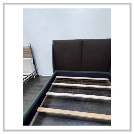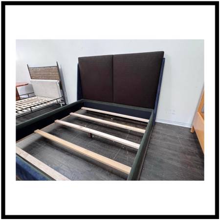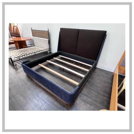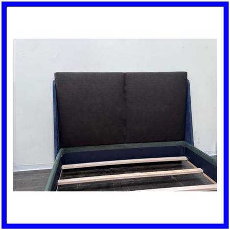 Design Plus Gallery presents an Eastern King Custom Made Bed Frame. The beds threetone palette layers color and texture for a tailored, modern look: the side rails are upholstered in a green and blue fabric, the footboard and back of the headboard are wrapped in a complementary blue fabric, and the two back cushions that form the cushioned headboard are finished in a black. The result is a sophisticated mix of hues that anchor the room while adding subtle depth and dimension. The refined statement piece has an exposed wood base. Is in good condition, visible and minimal wear from usage. Made in the USA.