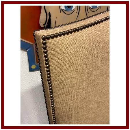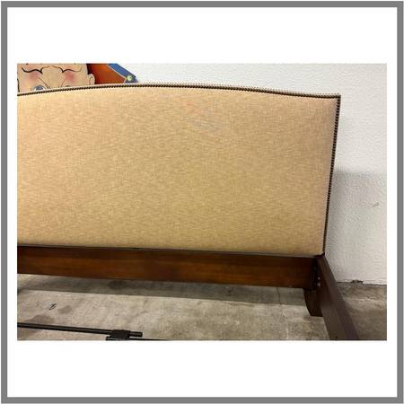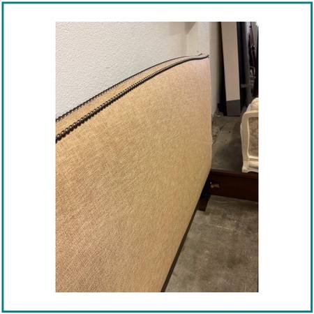 Design Plus Gallery presents the Chelsea Bed by Thomas OBrien for Hickory Chair and Century Furniture.The bed has mahogany veneers/solid wood with a dark stained frame that contrasts beautifully with rich beige textured fabric headboard. Detailed with antiqued bronze nailhead that radiates classic elegance within its simple silhouette. Light surface wear; condition is good.