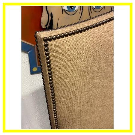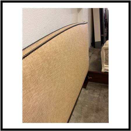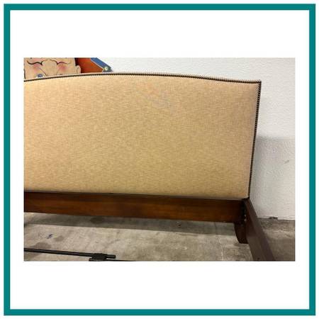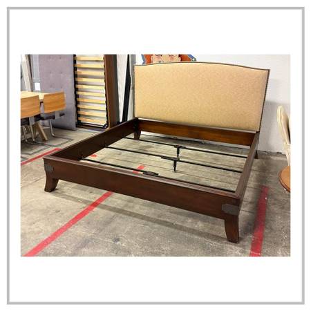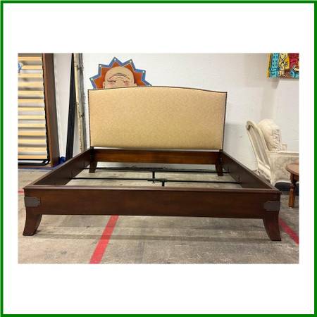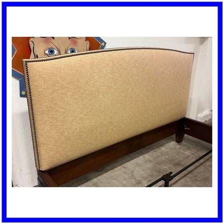 Design Plus Gallery presents the Chelsea Bed by Thomas OBrien for Hickory Chair and Century Furniture.The bed has mahogany veneers/solid wood with a dark stained frame that contrasts beautifully with rich beige textured fabric headboard. Detailed with antiqued bronze nailhead that radiates classic elegance within its simple silhouette. Light surface wear; condition is good.