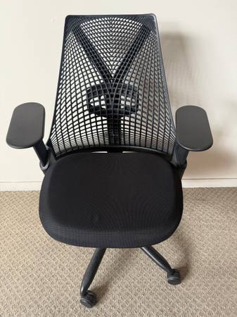 (1) Used Herman Miller Sayl AS1SA-22AAAJ black Y tower & suspension back work chair with standard height range pneumatic seat height adjustment, tilt limiter, seat depth adjustment, tilt tension, adjustable lumbar support & black fully adjustable arms. Black base. Black fabric seat pan. $475 (They sell for $955 at Herman Miller online store)