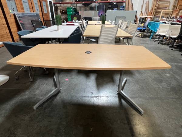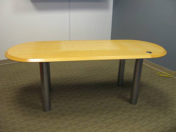 (1) Used 72L x 30D & 36D boat shaped table (1 piece top) in maple laminate with 3.5" black access grommet cover & (2) silver finish metal legs $550