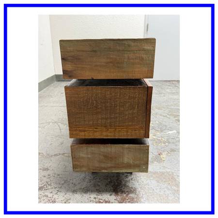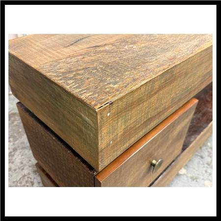 Design Plus Gallery presents a Dillon Console Table from Four Hands. From the Bina Collection. Long and lean with undeniable presence, the Dillon Console delivers stylish storage in a slender profile. Stacked, contrasting planes of American walnut, peroba, and cruzeta woods seem to hover in formation above airy iron supports, while rounded brass hardware lends a soft, refined touch. Two dovetail drawers to keep everyday essentials neatly tucked away. Handcrafted from a thoughtful mix of sustainably harvested and reclaimed woods, Dillon layers rough and refined textures with timeworn patinas for a rusticmodern look that bridges old and new. Because the materials are reclaimed, subtle variations in grain, color, and tone make each piece truly one of a kind. Simple yet sculptural, this long, narrow console feels light in the room and blends beautifully with a range of decorating stylesperfect for entryways, hallways, or behind a sofa. This is a discontinued model. In good condition, visible and minimal wear from usage.