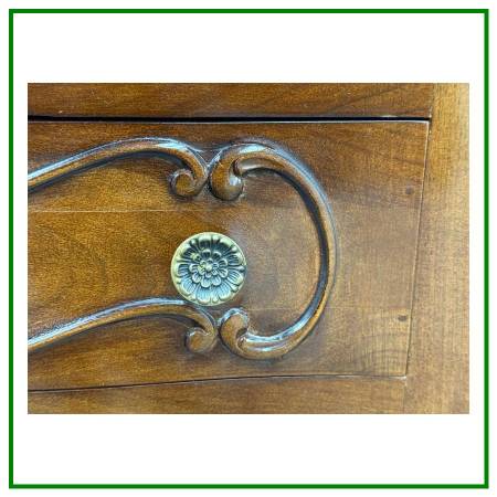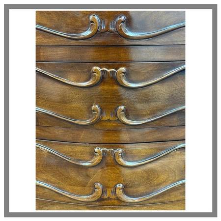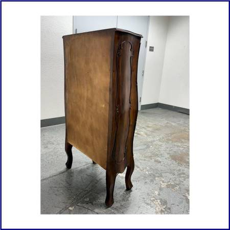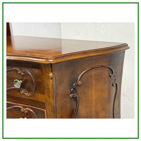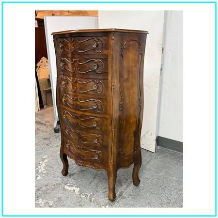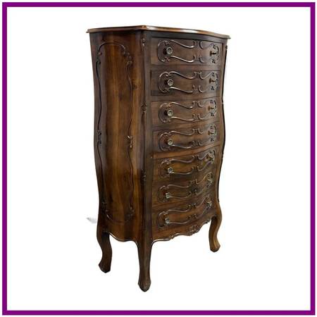 Design Plus Gallery presents a Chest of Drawers in the Louis XV Style. The chest of seven drawers is perfect to tuck into a small niche in your home for storing valuables or soft linens. It has serpentine shapes to the sides with a bow front facades enhanced by the carved symmetrical molding. The boldly scrolled apron below is flanked by scrolled legs carved with upturned acanthus plumes and tipped with escargot feet. The sheer beauty of the wood is an everlasting charm. It is in good condition with visible wear that is consistent with its usage.