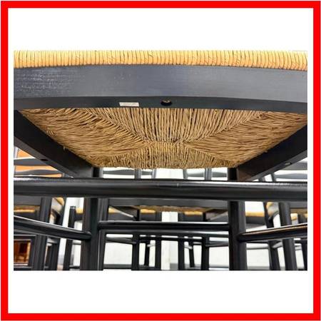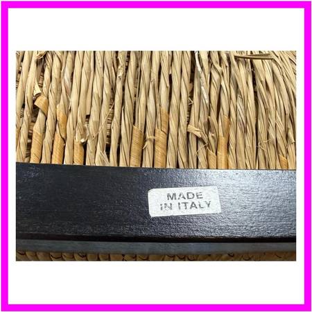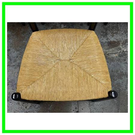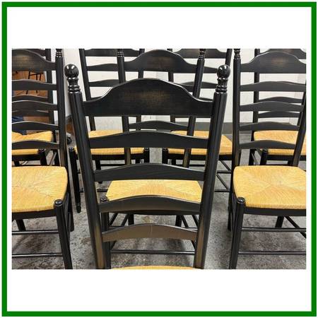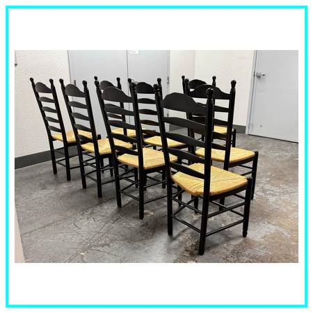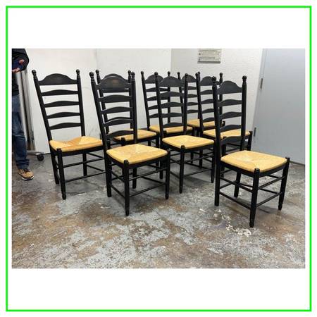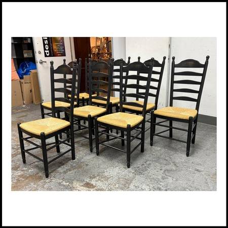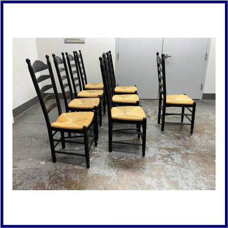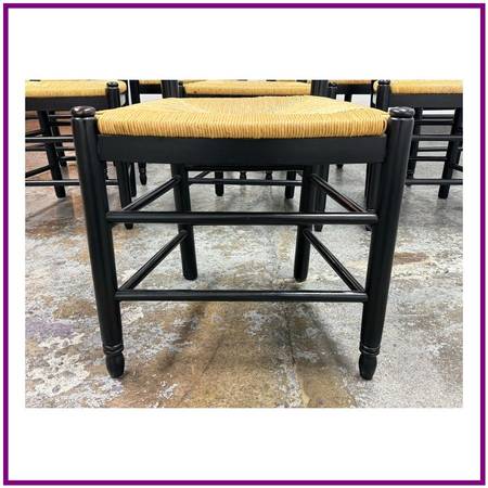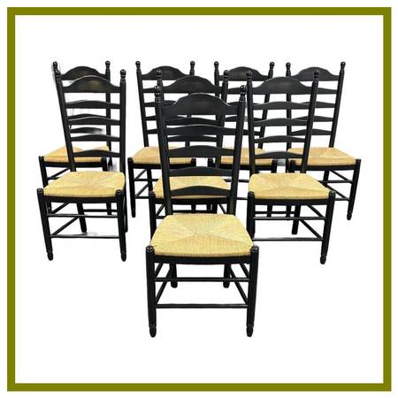 Design Plus Gallery presents a Set of Eight Ladderback Dining Chairs in a French Provincial Style. The dark wood chairs have a deep brown tone that nearly looks black. There are four slats to the back that lead up to pointed finial shapes at the top of the frames. Below the rush woven seats there are stretchers that connect the legs, providing stability to the wooden frame. One of the rush seats will require repair but overall the set is in good condition with minimal visible wear. The set is priced for a set of 7 chairs with a free chair. Made in Italy.