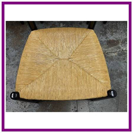 Design Plus Gallery presents a Set of Eight Ladderback Dining Chairs in a French Provincial Style. The dark wood chairs have a deep brown tone that nearly looks black. There are four slats to the back that lead up to pointed finial shapes at the top of the frames. Below the rush woven seats there are stretchers that connect the legs, providing stability to the wooden frame. One of the rush seats will require repair but overall the set is in good condition with minimal visible wear. The set is priced for a set of 7 chairs with a free chair. Made in Italy.