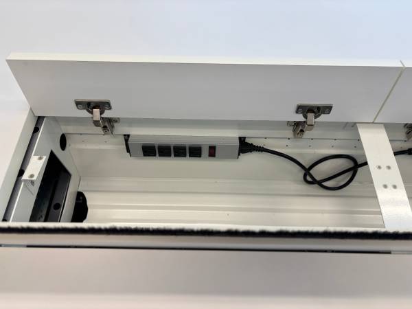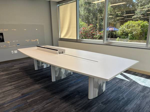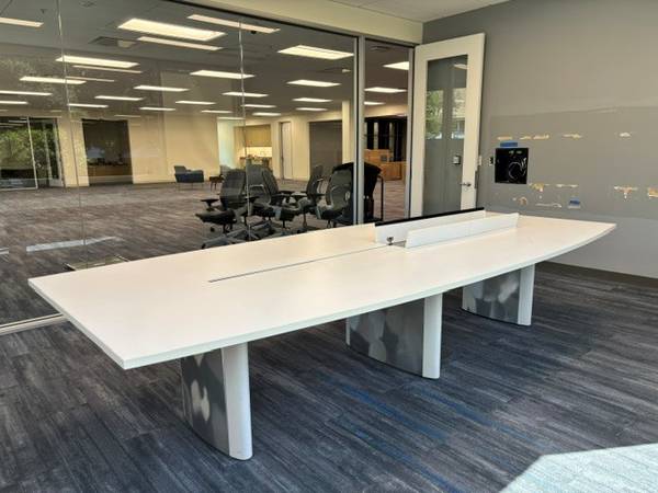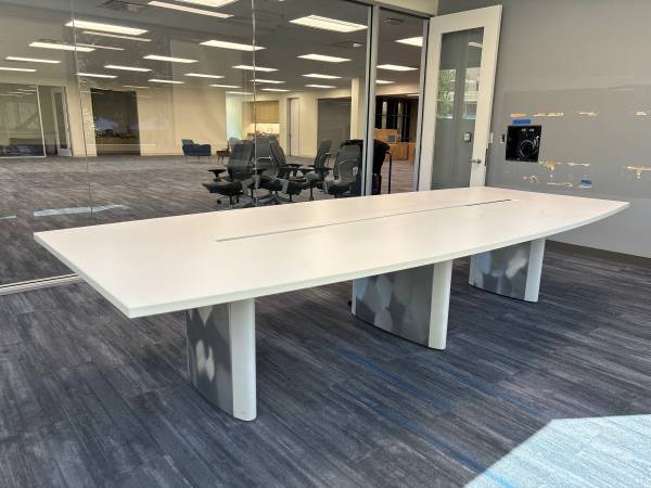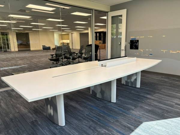 Up for sale is contemporary looking, commercial grade, pre-owned Friant 12 Ft long x 4 Ft & 5 Ft deep boat shaped table (2 piece top) in white laminate with (2) flip door access power modules, trough & (3) white accent aluminum panel bases.