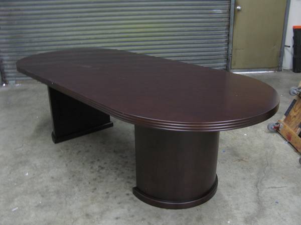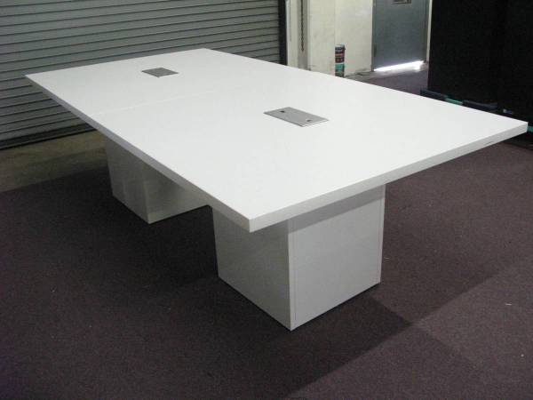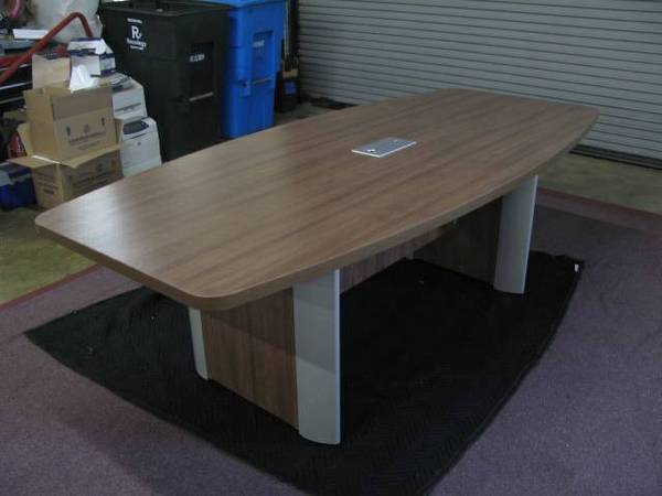 New PL series 95"L x 33"D & 44"D boat shaped table (1 piece top) with (1) silver finish access grommet cover & (2) panel bases $450 (It's available in cherry, espresso, aspen, modern walnut & white laminate. It's also available in 10 Ft, 12 Ft, 14 Ft, 16 Ft, 18 Ft & 20 Ft)