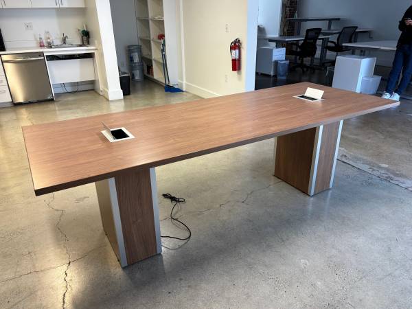 (1) Used 8 Ft x 3 Ft rectangular table (1 piece top) with (2) nickel finish power & data modules & (2) rectangular bases in walnut laminate $1,150