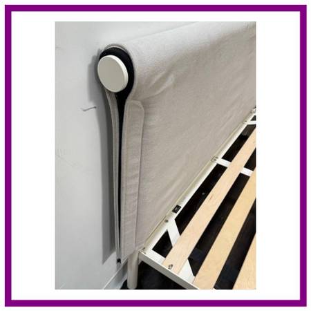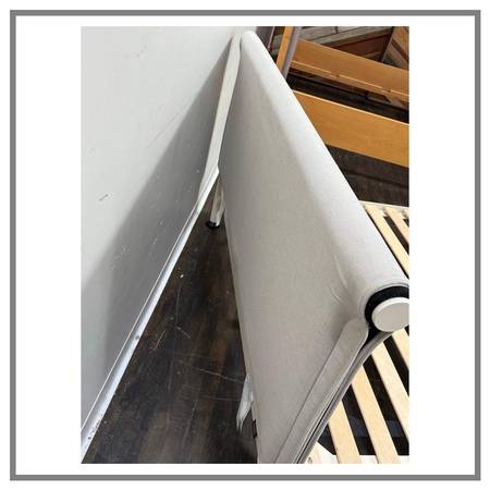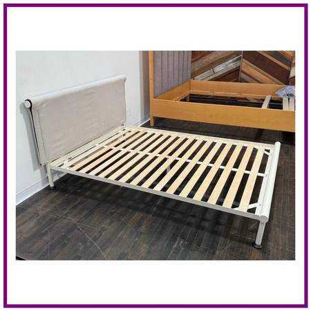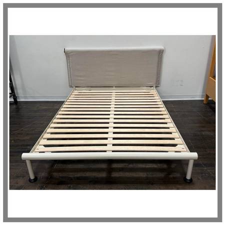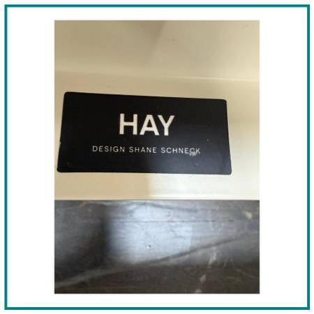 Design Plus Gallery presents the Full Size Tamoto Bed Frame Designed by Shane Schnek for Hay X Design Within Reach. The Tamoto style was influenced by the draping quality of kimono sleeves that inspired with its folding of fabric over the beds headboard. This softly draped headboard is counterbalanced by the generously steel tubing frame. With a flatpacked, easytoassemble design, removable headboard cover and recyclable materials, functionality has been factored in every step of the design process. In good condition, visible and minimal wear form usage.