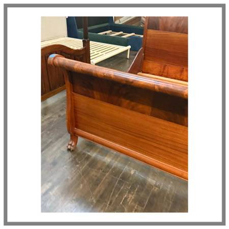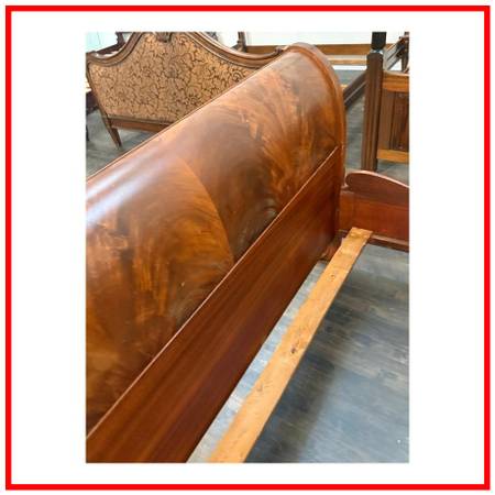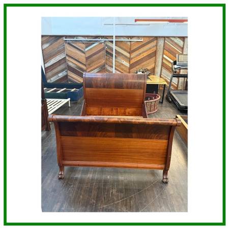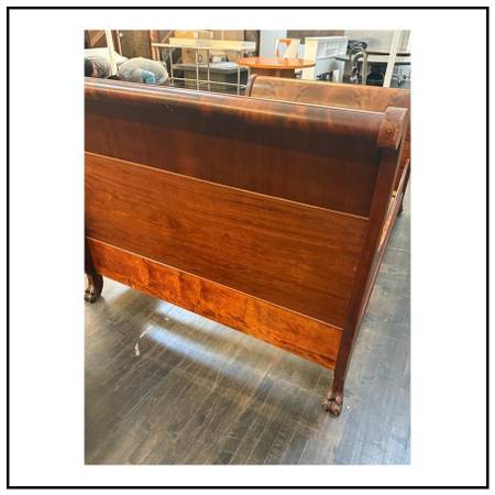 Design Plus Gallery presents a Vintage Full Size Sleigh Bed Frame. A striking example of 19thcentury American Federal period craftsmanship. Its design features an elegantly curved headboard and footboard, both gracefully scrollshaped. The frame is crafted from solid woods and showcases a stunning flame mahogany veneer, notable for its rich, reddishbrown hue and dramatic, undulating grain patterns that catch the light beautifully. Features intricate carved claw feet, which anchors the frame with a sense of grandeur and historical authenticity. In good condition, visible wear from usage.