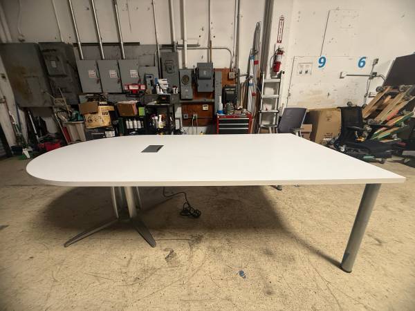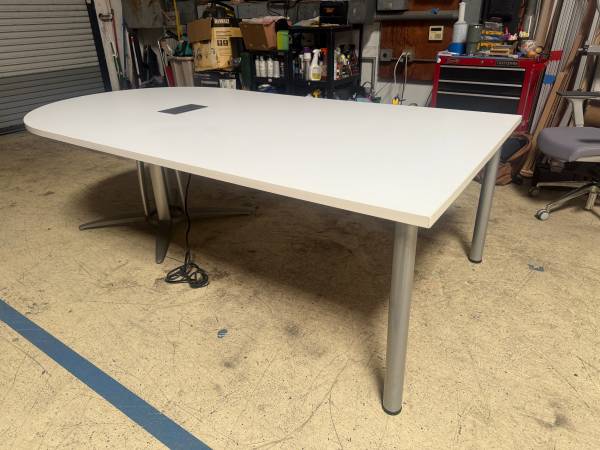 (1) Used HPL 93L x 49D half racetrack table (2 piece top) with power module in white laminate top & (2) silver finish cylinder legs & (1) 4 star steel base $695