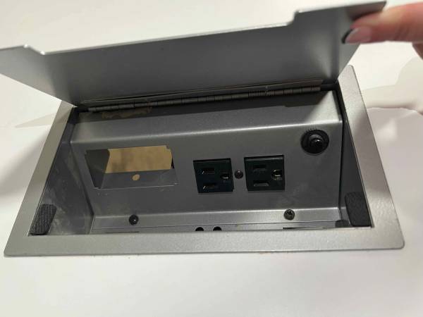 (1) Used Friant 12 Ft x 4 Ft & 5 Ft boat shaped table (2 piece top) in white laminate with (2) flip door access power modules, trough & (3) white accent aluminum panel bases. $1,650