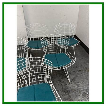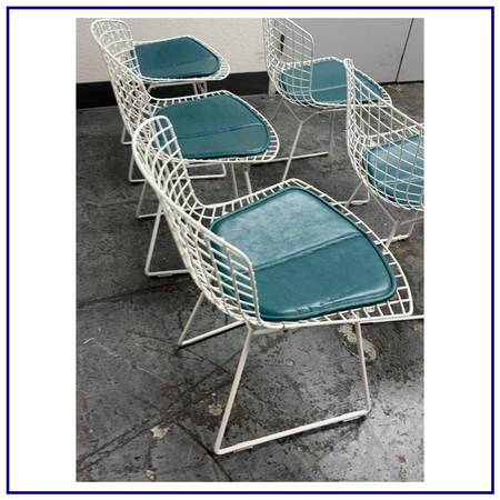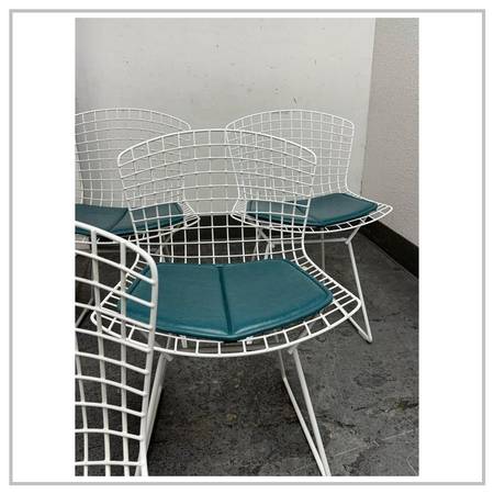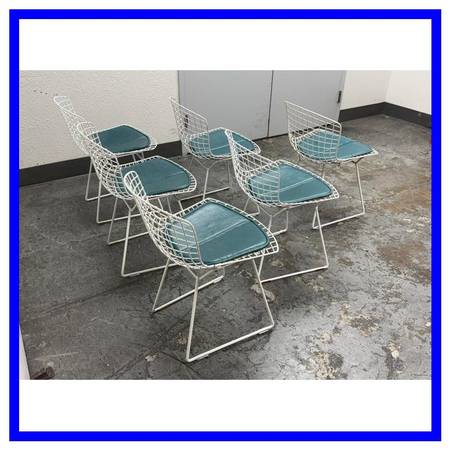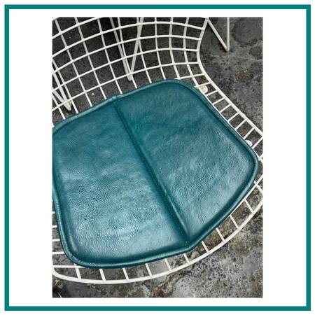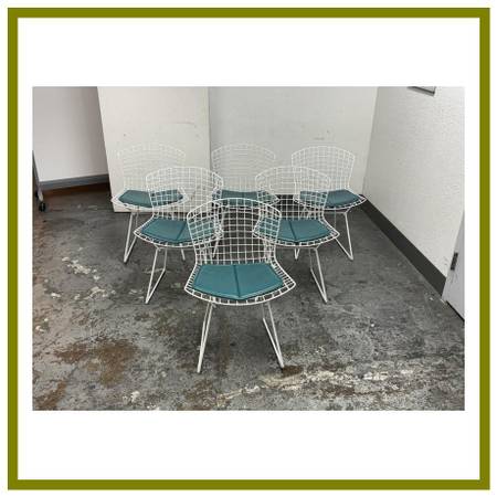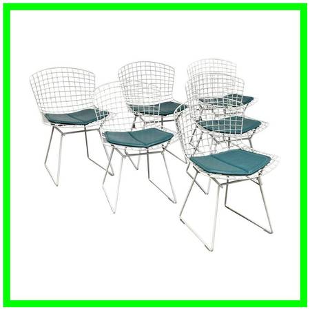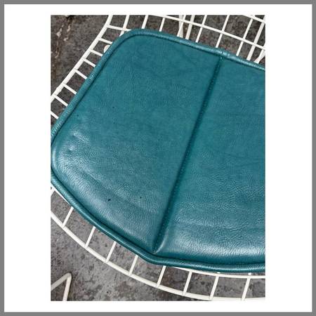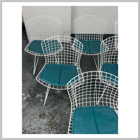 Design Plus Gallery presents a Set of Six Harry Bertoia Chairs by Knoll. They were refinished in white and have wire basket seats on a sled leg frame with turquoise vinyl seat pads. They show some signs of wear that are consistent with usage and one seat has a crack in the seat. Overall they are in fair condition.