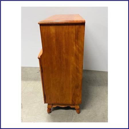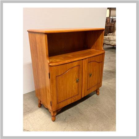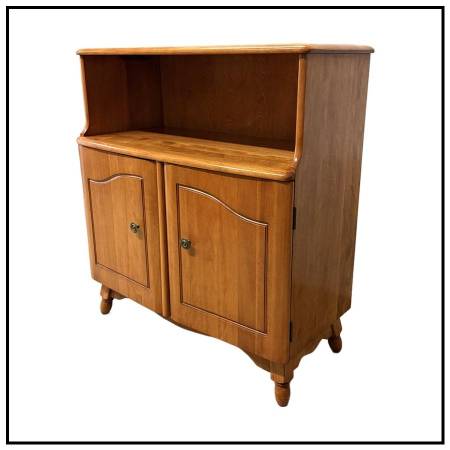 Design Plus Gallery presents a Vintage Colonial Cabinet from Heywood Wakefield. This solid wood cabinet, meticulously designed and crafted in the 1950s, provides ample display space, both open and closed, all within a compact footprint. Its curved panels and apron details, complemented by a turned foot, removable shelf, and original cast brass pulls, contribute to its timeless appeal. Over the years, this cabinet has been owned by a single family, serving as a cherished piece of their home. Visible surface wear; condition is consistent with age and use.