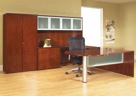 New Kenwood 36"D/42"D x 72"L Teardrop table desk with half glass modesty panel with silver cylinder leg, 24"D x 48"L left bridge, 20"D x 72"L multi-file left pedestal credenza with 4 hinged silver frame glass door hutch in cherry wood (Also available in mahogany wood for the same price with approx 2 weeks lead time). Overall Dimensions are 104"D / 110"D x 72"W. $2,395 new in box or $2,695 assembled / floor sample.